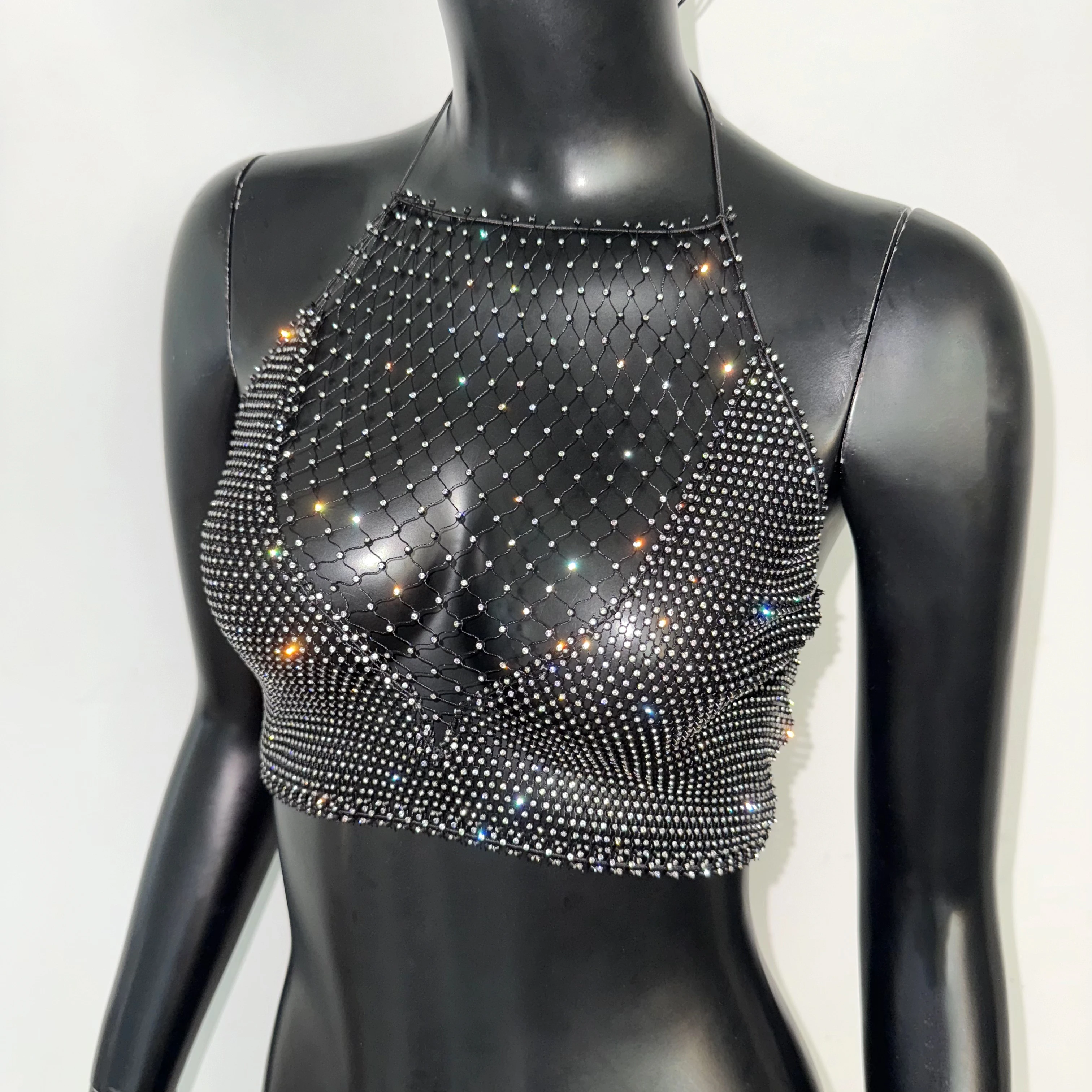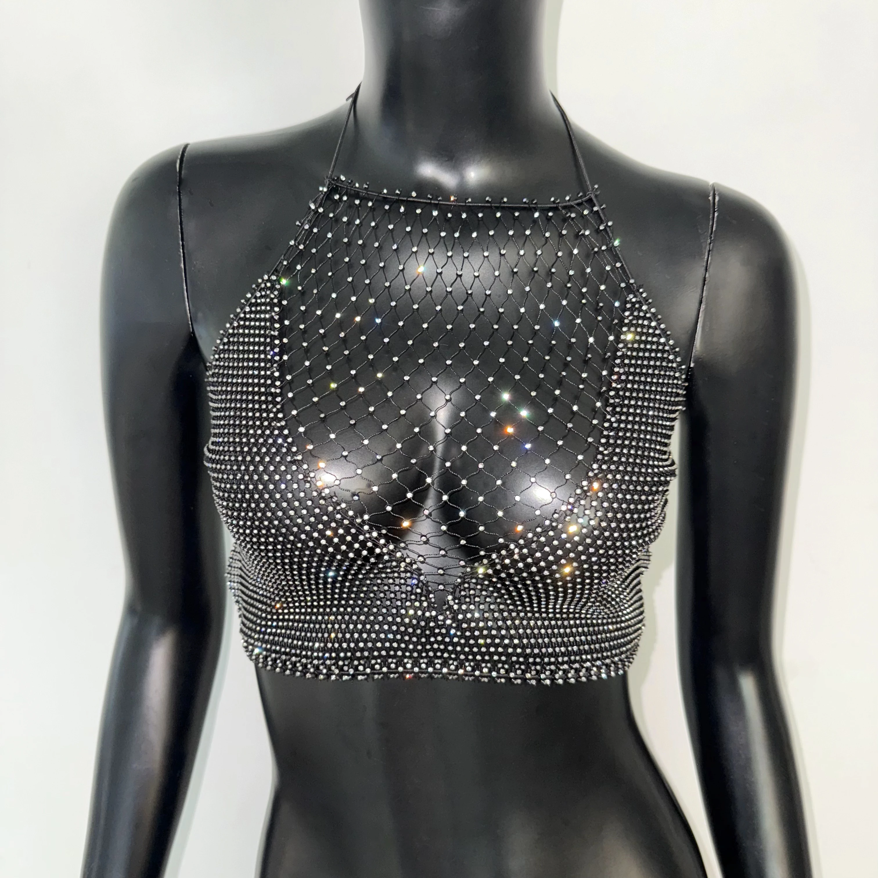 AKYZO European And American Splicing Bright Diamond Fishing Net Spicy Girl Suspender Sexy Party Vest Top
